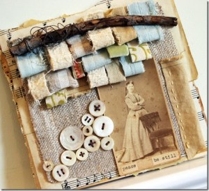 Sanctuary 02 art collage jan 09 + Seasonal Shades Preview fabric collage + What Baxter ate… an assemblage + The shrine is a tribute of a time where men control the seas and seek new adventure.