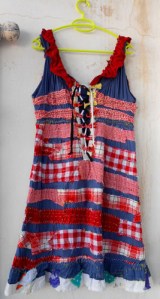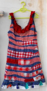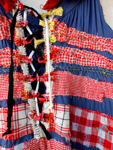 Before being wrapped with strips of red & white checkered fabric, it was a voluminous purple dress. The variations of the checks remind me of variations in brain wave frequencies.