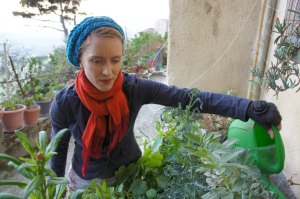 Clare watering her plants, Photo copyright Chris Webster, Filming of House Hunters International via Clare’s Facebook Page