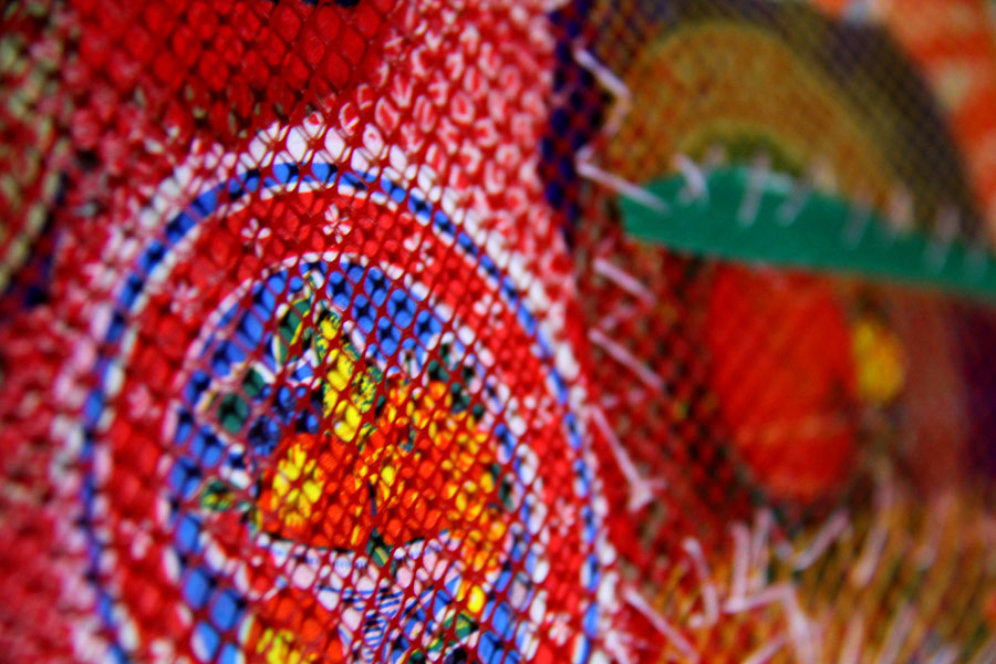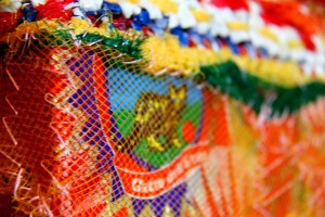 This is a purse I made using only refuse materials found at the Trieste Market – cardboard, netting, plastic bags, bottle cap and orange wrappers.