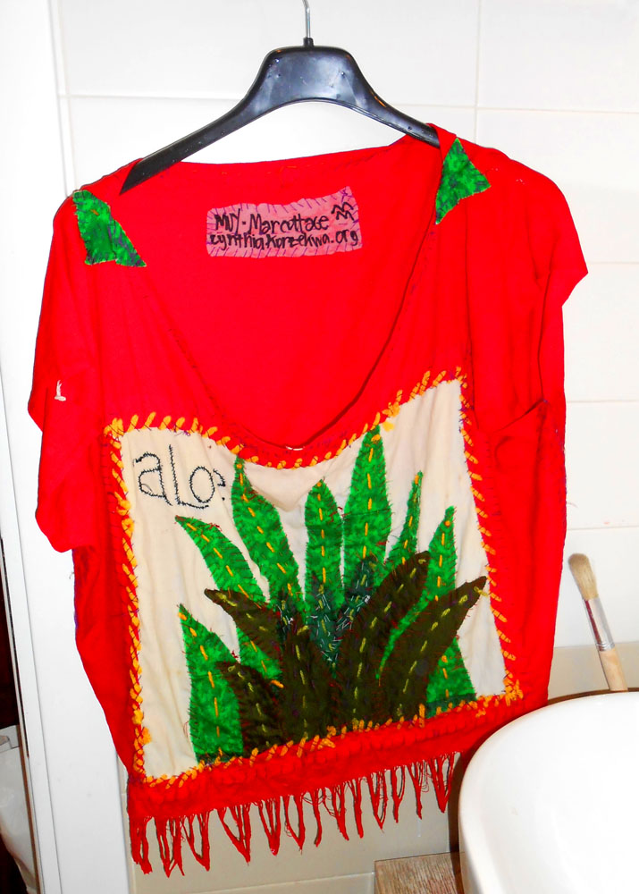 The huipil in the foto above was made from a red linen runner, dish towel and fabric scraps. And the aloe was created with applique. Fabric collage.