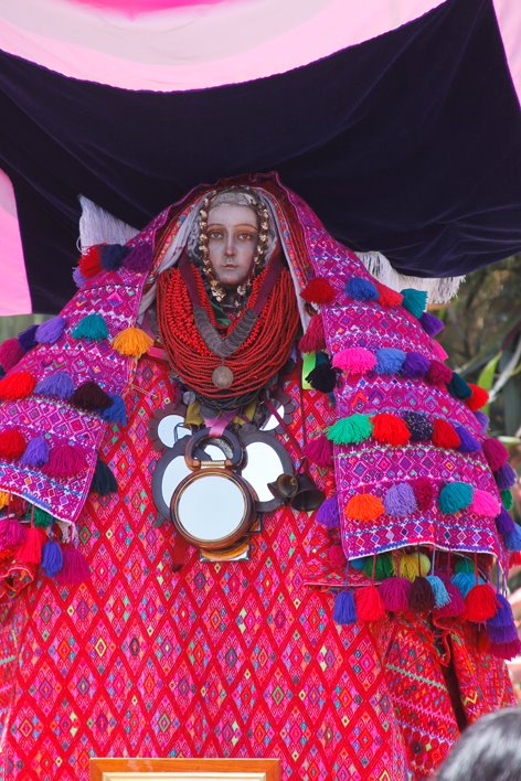 The Virgin wearing huipiles at Magdalenas, village in Chiapas known for it’s weaving.