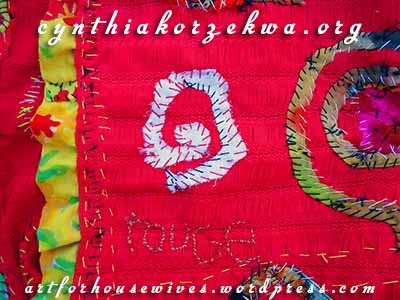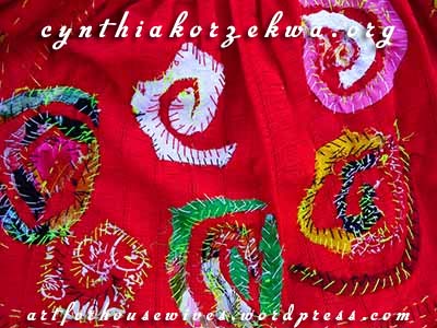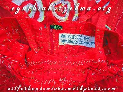 The above Muy Marcottage dress is named “Rouge” because it was made from a red fabric (probably once curtains) that looks like sangallo (eyelet). It has thin straps and is body hugging until the buttocks where it then is attached to a gathered skirt of the same fabric. It is completely handsewn into place with white thread and has a zipper in the back. The skirt, trimmed with a yellow print, is covered with spirals made from fabric scraps.