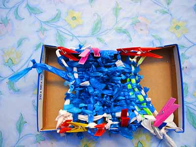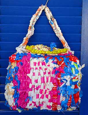 When making plarn (plastic bag yarn), handles and bottom seams can be recycled for weaving as illustrated below. I weave little squares then sew them onto plastic bags cut into squares which, in turn, are sewn together. I like purses to be sturdy so I sewed the patchwork squares onto an empty wine carton. The handles and the covering for the top of the purse pictured were made by using plastic bag crochet. Stitching with regular thread was added as a form of extra embellishment.
