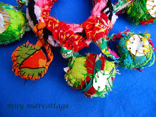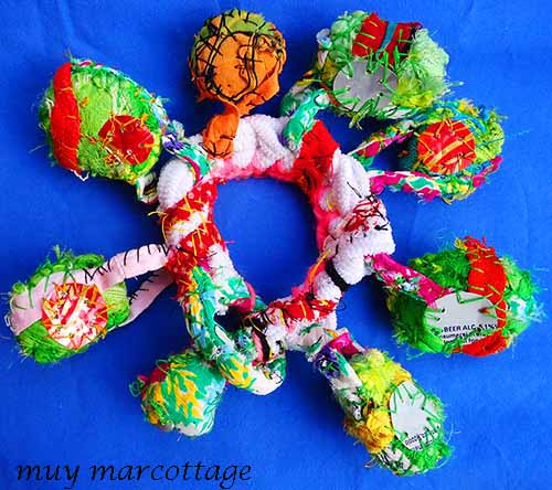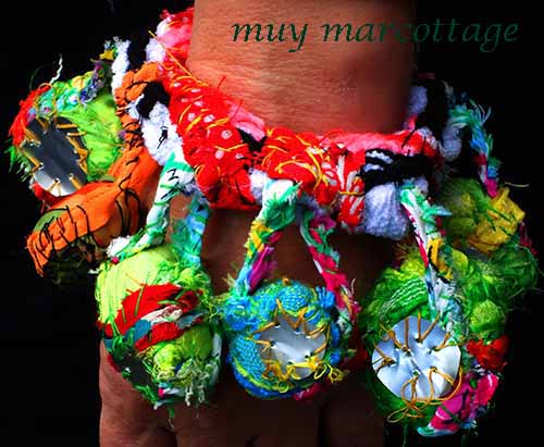 This bracelet does not make noise but it does whisper. It is made from many materials exiled together to create a community: strips of an old t-shirt crochet into a band, scraps of fabric covered by scraps of fabric to create beads, seams from ripped clothing to created links and soda cans cut into small disks to create paillette sequins.