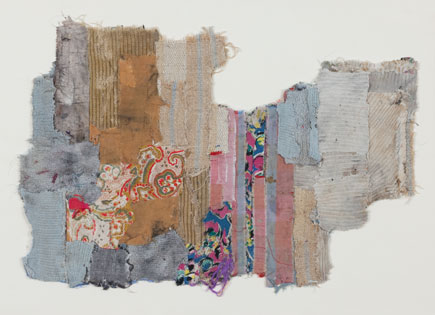 Geta at the Threaded Stories Exhibition….”A selection of works from Geta Brătescu’s ‘Vestigii’ (Vestiges) series of 1978 feature patches of scrap fabric layered to form a textured collage. Installed on the wall, their tattered edges and patchwork quality appear to hover on the edges of abstraction and figuration. Scraps of bright fabric patterns and hues are mixed and muddled, as their layers often expose the wall behind. A leading figure of Romanian Conceptualism, Brătescu has been the subject of a recent major solo exhibition at MUSAC (Museo de Arte Contemporáneo de Castilla y León) and was recently included in the 2013 Venice Biennale and the 12th Istanbul Biennale in 2011. Brătescu’s work blurs the lines between art and the everyday, enhanced by her focus on the process and production of art and the linking of her upbringing in Communist Romania.”