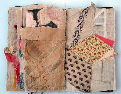 Above are examples of her sample books. A few years ago she bagan cutting up domestic hand embroidery and sewed them into books. Often, the back of the work is shown as the front to highlight the element of stitching.