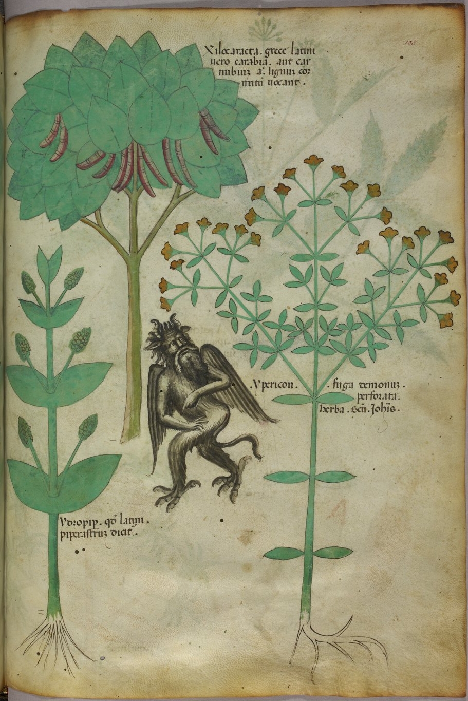 A friend recently passed along a fabulous blog called BibliOdyssey, as well as a post with illustrated manuscript belonging to a 15th c. herbal text titled the Codex Sloane 4016. Like other early manuscripts focusing on herbs, these treatises documented accumulated knowledge about medicinal plants from the oral tradition. In the image above you will immediately recognize St. John’s Wort as the medieval “ypericon”, known now by the latin hypericum perforatum. With the myriad uses for the invaluable St. John’s Wort, SSRI action, anti-viral activity, and vulnerary for nervous system-related symptoms among them, what I did not know was that St John’s Wort was also considered a demon repellent. And what a cute little demon we have here in this medieval illustration, not unlike the many forms of hybrid creatures found on the column lintels that would have surrounded monastic herb gardens of that period. I…