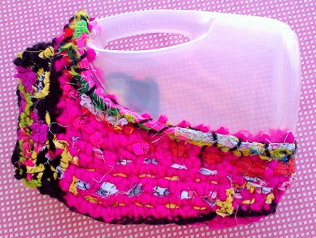 This is a little clutch made from a transparent detergent bottle. I cut the bottle open then used scrap materials to crochet the missing part. There’s a flap that opens on the front kept in place by velcro.