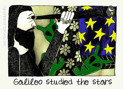 Thanks to a telescope and constant observation, Galileo discovered that the Earth did not stand still but, instead, evolved around the sun. The Catholic Church could not tolerate a theory where man and the Earth were not the center of everything. So Galileo was denounced as dangerous to the faith and the Inquisition sentenced him to permanent house arrest.