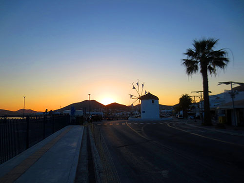 Windmill at the port that also serves as tourist info office waiting to be illuminated by the sun.