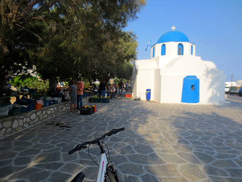Physical activity helps stabilize emotional stress. So every morning we ride our bikes to Livadia. On the way back this morning we stopped at the farmer’s market under the tamerisks near the port. We got a big cantaloupe with its unmistakable fragrance that’s still in my nose.