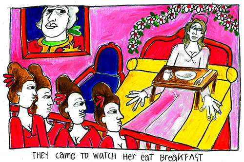 One day Marie-Antoinette was feeling particularly down. She wanted to break with the routine, to improvise, to play. ”Novelty is what I need,” she told Princess de Lamballe. Well, Novelty is my middle name so the princess told her about me and my extemporaneous recitations. That’s how I got invited to the Petit Trianon.