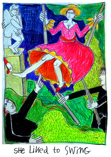 The painting portrays a young woman flying high in a swing pushed by an elderly man. She kicks off one of her shoes so that, with her leg raised, a young man hiding in the bushes can see under her dress. Rumor was that it had been commissioned by Baron de Saint-Julien and that the woman in the painting was his mistress. On the left is a statue of cupid looking on with his finger to his lips indicating that there’s a secret to be kept. Such a naughty painting, decadent with frills, is a real bijou!