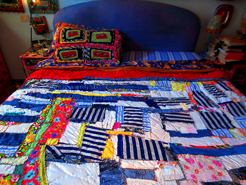 The blanket on my bed is very old and very worn. In some areas, the fabric is so frayed that it’s practically non-existent. It had to be mended so I started covering the worn areas with fabric scraps. Once I got started patching, I couldn’t stop until I’d covered the blanket’s entire surface.
