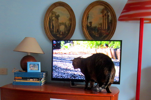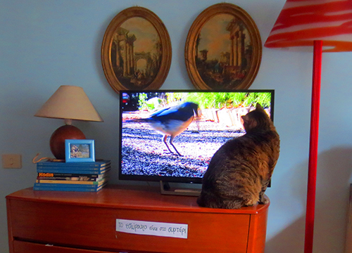 Our cat, Volver, discovered TV last year. For years he’d never given it any consideration then suddenly he became a fan. Now he even has his own youTube playlist. Not all videos excite him as much as the one with the big bird that got away. Volver got as near as possible to the screen and started clawing it trying to get to the bird. The bird flew away and Volver searched for him everywhere.