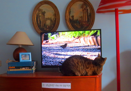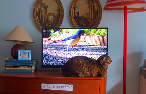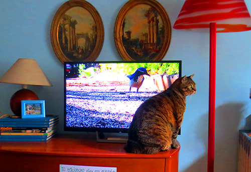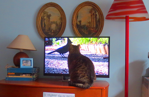 Our cat, Volver, discovered TV last year. For years he’d never given it any consideration then suddenly he became a fan. Now he even has his own youTube playlist. Not all videos excite him as much as the one with the big bird that got away. Volver got as near as possible to the screen and started clawing it trying to get to the bird. The bird flew away and Volver searched for him everywhere.