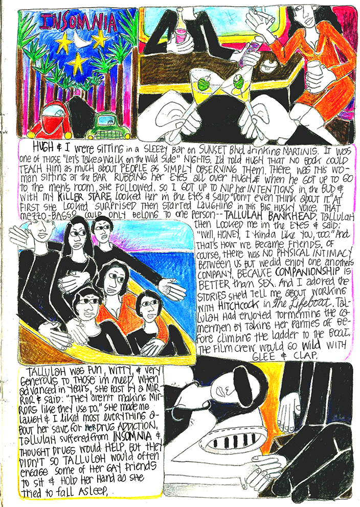 Hugh and I were sitting in a sleazy bar on Sunset Blvd drinking martinis. It was one of those “let’s see how the other half lives” nights. I’d told Hugh that no book could teach him as much about people as simply observing them. I noticed this woman who had her eyes all over Hugh and when he got up to go to the men’s room, she followed. So I got up to stop her in her tracks and, with my killer stare, looked her in the eye and said “Don’t even think about it”. At first she looked surprised then started laughing in this big husky voice. That mezzo-basso could only belong to one person–Tallulah Bankhead. Tallulah then looked me in the eyes and said: Well Honey, I kinda like you, too. And that’s how we became friends.