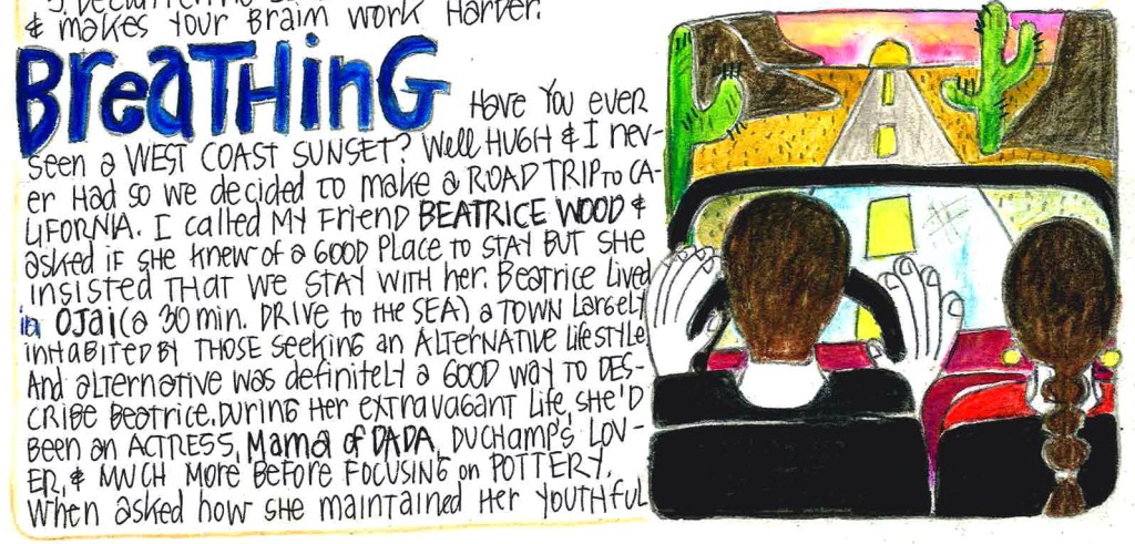Have you ever seen a West Coast Sunset? Well Hugh and I never had so we decided to make a road trip to California. I got in touch with my friend Beatrice Wood and asked if she knew of a good place to stay. But she said: You will stay with me, of course! Beatrice live in Ojai (only a 30 min drive to the sea), a town largely inhabited by those seeking an alternative lifestyle. And alternative was definitely a good way to describe Beatrice. During her extravagant life, she’d been an actress, Mama of Dada, Duchamp’s lover, and much much more before deciding to focus on pottery. When asked how she maintained her good looks, she’d reply: I owe it all to chocolate and young men.