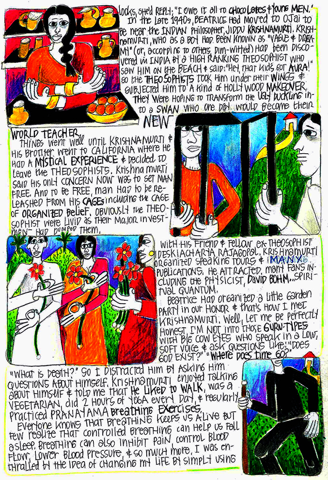 In the late 1940s, Beatrice moved to Ojai to be near the Indian philosopher, Jiddu Krishnamurti. Krishnamurti, who as a boy had been known as “vague and dreamy” (or, according to others, dim-witted) had been discovered in India by a high-ranking Theosophist who saw him on the beach and said “Hey, that kid’s got aura!”. So the Theosophists took him under their wings and subjected him to a kind of Hollywood Makeover. They were hoping to transform the ugly duckling into a swan who one day would become their new World Teacher.