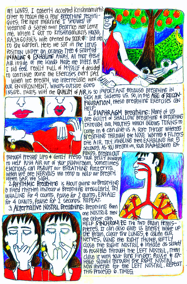 Beatrice had organized a little garden party in our honor and that’s how I met Krishnamurti. Well let me be perfectly honest, I am not into those guru types with big cow eyes who speak in a low voice and ask questions like: Does god exist? Where does time go? Do you want to talk about death? I wanted to say: No I don’t want to talk about death. I want to dance the cumbia! But, instead, I asked him questions about himself and how he spent his days. Krisnamurti said he liked to walk, was a vegetarian, did two hours of yoga every day, and regularly practiced pranayama breathing exercises.