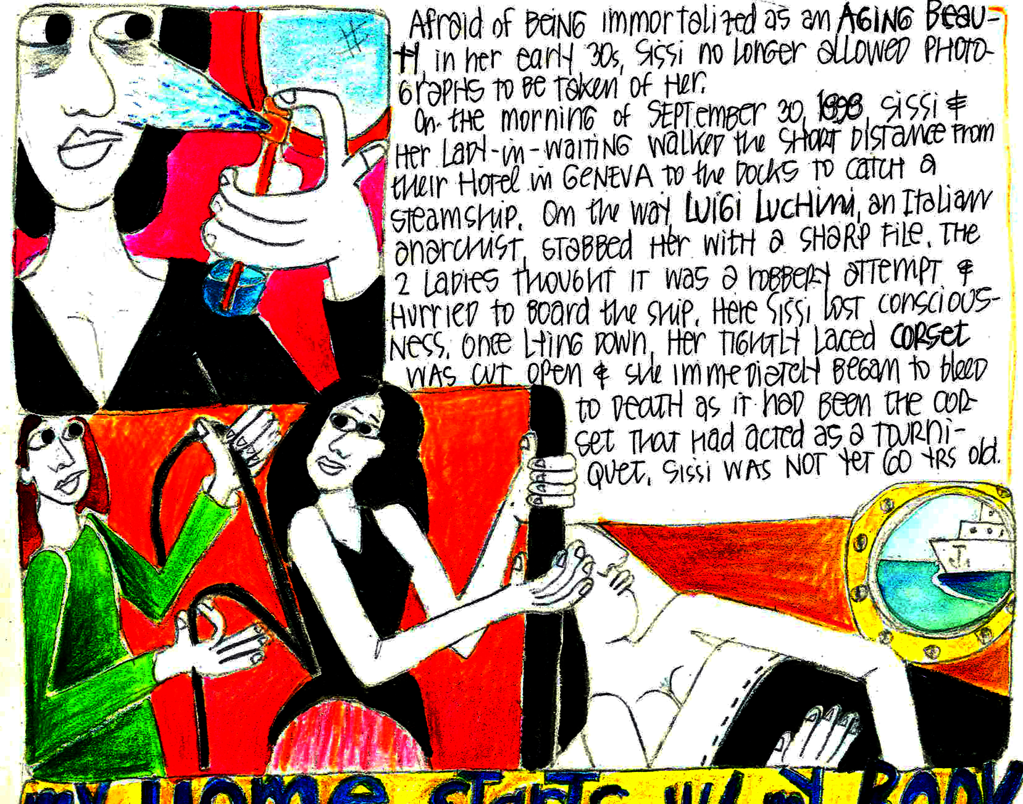 On the morning of September 10, 1898, Sissi and her lady-in- walked the short distance from the hotel in Geneva and to the docks to catch a steamship. On the way Luigi Lucheni, an Italian anarchist, stabbed her with a sharp file. The two ladies thought it was a robbery attempted and hurried to board the ship. Here Sissi lost consciousness. Once lying down, her tightly laced corset was cut open and she immediately bleed to death. For it had been the corset that had kept her from bleeding to death immediately. She was not yet 60 years old.