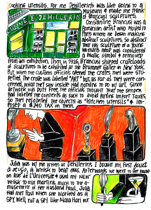 Since we were both Americans, it was only natural that we started hanging out together. Often we’d have onion soup at the nearby Au Pied de Cochon or go to Les Halles to buy vegetables or to Dehillerin’s to buy cooking utensils. For me Dehillerin’s was like going to a museum and made me think of Brancusi sculptures.