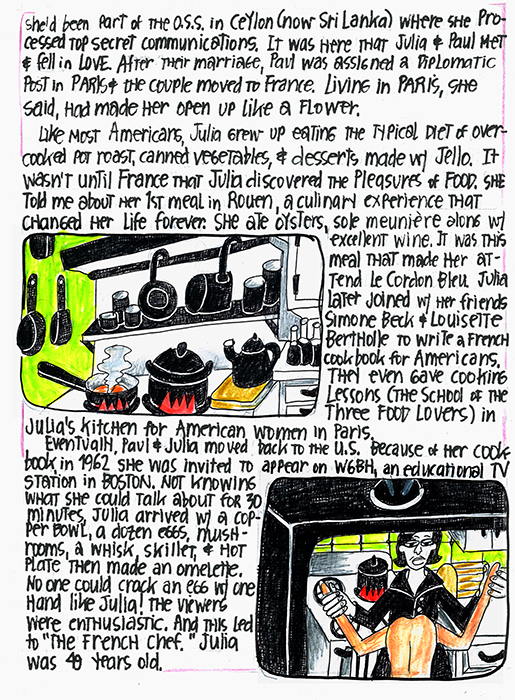 Like most Americans, Julia grew up eating the typical diet of overcooked pot roast, canned vegetables, and desserts made with Jello. It wasn’t until France that Julia discovered the pleasures of food. She told me about her first meal in Rouen, a culinary experience that changed her life forever. She ate oysters, sole meunière along with excellent wine. It was this meal that made her attend Le Cordon Bleu. Julia later joined with her friends Simone Beck and Louisette Bertholle to write a French cookbook for Americans. They even gave cooking lessons (The School of the Three Food Lovers) in Julia’s kitchen for American women in Paris.