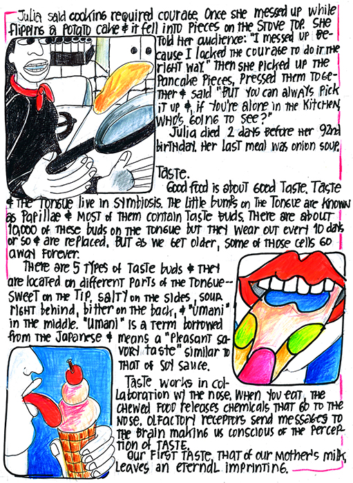 Julia said cooking required courage. Once she messed up while flipping a potato cake and it fell into pieces on the stove top. She told her audience: “I messed up because I lacked the courage to do it the right way”. Then she picked up the pancake pieces, pressed them together and said “But you can always pick it up and, if you’re alone in the kitchen, who’s going to see?”