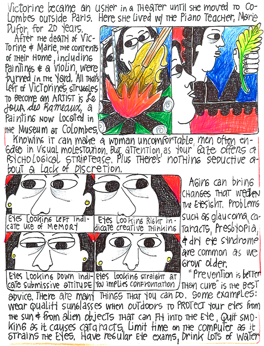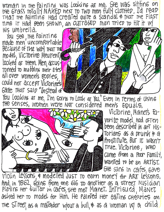 When walking down the street, notice the men looking at women and turning them into objects. This looking is not a reciprocal experience as women, when walking alone, avoid eye contact because eye contact attracts attention it’s considered provocative as Victorine Meurent knew well.
