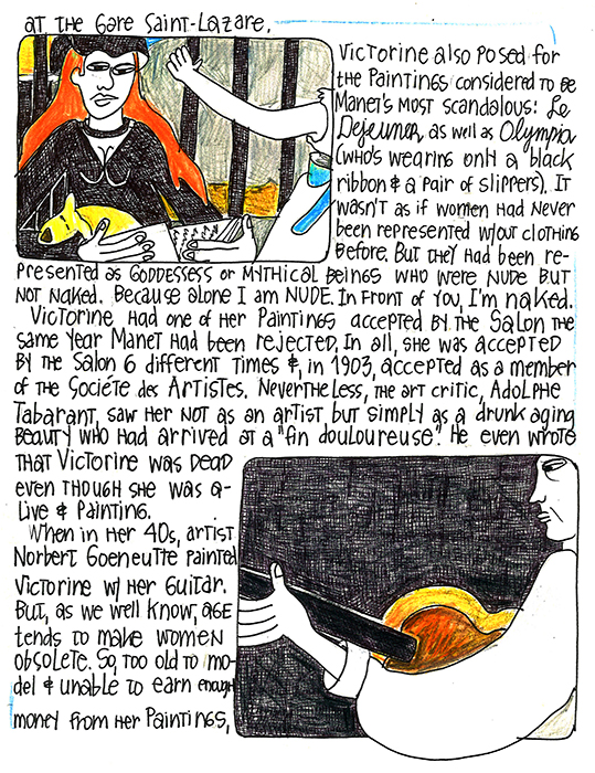 When in her 40s, artist Norbert Goeneutte painted Victorine with her guitar. But, as we well know, age tends to make women obsolete. So, too old to model and unable to earn enough money from her paintings, Victorine became an usher in a theater until she moved to Colombes outside of Paris. Here she lived with the piano teacher, Marie Dufour, for 20 years.