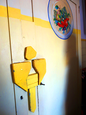 Notice the glass door with a yellow frame? It has a most incredible story…somehow the adjacent apartment had to, as some form of compensation for damage done, give one of its rooms to Balla so a big hole in the wall was made to create an opening.