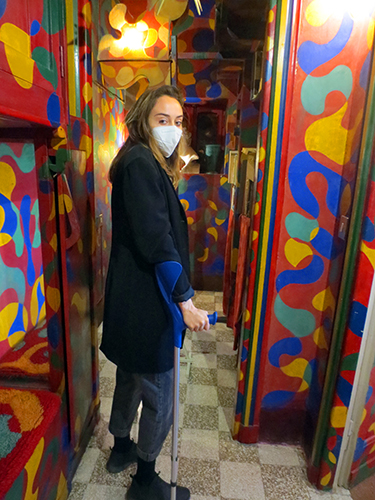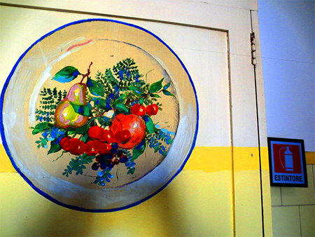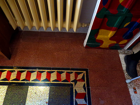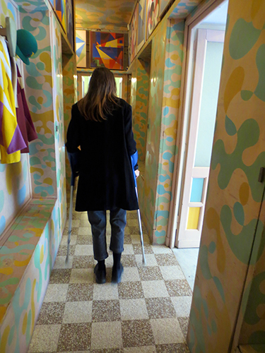 Part of the L-shaped hallway with its pastel colored amoeba-like shapes… Futurist painting, said Balla, wants to destroy immobility. So notice the painting hangings above (now copies, the originals removed). They are hanging from the ceiling as opposed to hanging on the wall. This way the painting can move if there’s a breeze and help Balla keep his painting in motion.