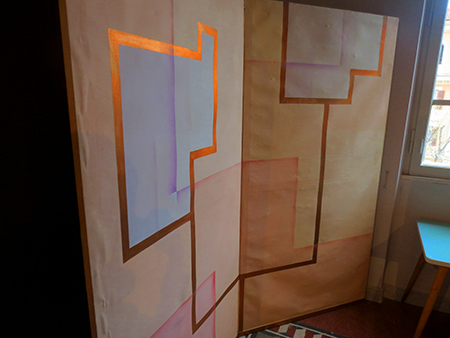 This screen is not a Balla original put painted in his style (maybe to fill up the space left by original objects that had been taken away). It reminds me somewhat of Fortunato Depero (who designed the Campari soda bottle still used today).