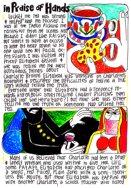 Luckily the tea was strong and helped keep me focused. I was at the table picking the raisins out from my scone not because I didn’t like raisins but simply to have an excuse to keep my head down so no one could see my facial expressions. I was visiting my friend Elizabeth Gaskell and she was telling me the most outrageous things about Charlotte Bronte. Elizabeth was working on Charlotte’s biography and described the difficulties of telling a true story without the truth.