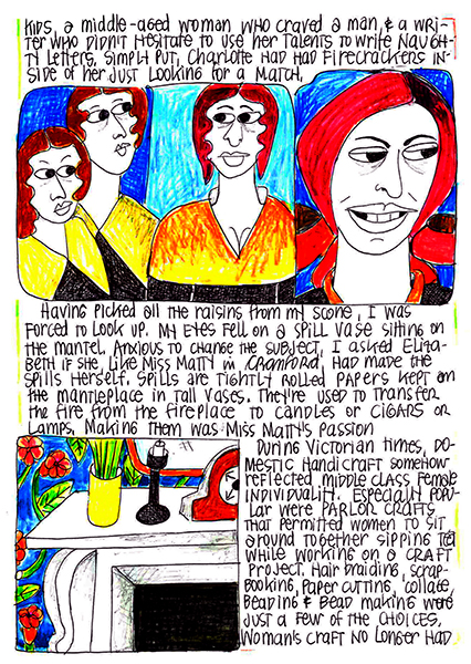 Having picked all the raisins from my scone, I was forced to look up. My eyes fell on a spill vase sitting on the mantel. Anxious to change the subject, I asked Elizabeth if she, like her Miss Matty in Cranford, had made the spills herself. Spills are tightly rolled papers kept on the mantelpiece in tall vases. They’re used to transfer the fire from the fireplace to candles or cigars or lamps. Making them was Miss Matty’s passion.