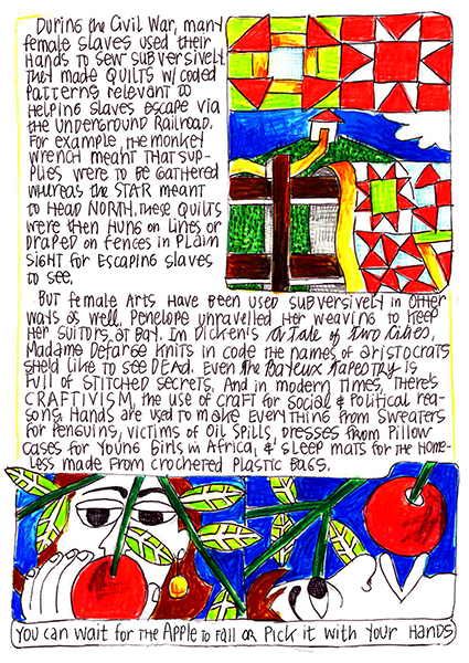 But female arts have been used subversively in other ways as well. Penelope unraveled her weaving to keep her suitors at bay. In Dickens’ Tale of Two Cities, Madame Defarge knits in code the names of the aristocrats she’d like to see dead. Even the Bayeux Tapestry is full of stitched secrets. And in modern times, there’s craftivism, the use of craft for social and political reasons. Hands are used to make everything from sweaters for penguins, victims of oil spills, dresses from pillow cases for young girls in Africa, and sleeping mats made from crocheted plastic bags for the homeless.
