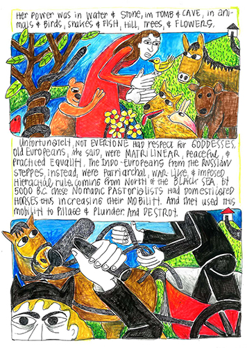 Unfortunately, not everyone had respect for goddesses. Old Europeans, she said, were matrilinear, peaceful, and practiced equality. The Indo-Europeans from the Russian steppes, instead, were patriarchal, warlike, and imposed hierarchical rule. Coming from north of the Black Sea, by 5000 B.C., these nomadic pastoralists had domesticated horses thus increasing their mobility. And they used this mobility to pillage and plunder. And destroy.