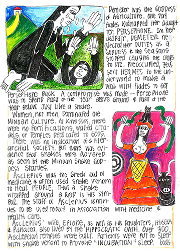 Demeter was the goddess of agriculture. One day Hades kidnapped her daughter, Persephone. In her despair, Demeter neglected her duties as a goddess and the seasons stopped causing the crops to die. Preoccupied, Zeus sent Hermes to the underworld to make a deal with Hades to get Persephone back. A compromise was made—Persephone was to spend part of the year above ground and part of the year below. Just like a snake.