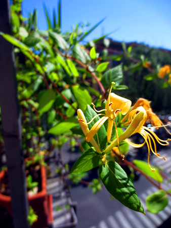 My Parian neighbor, Connie, has an incredibly wild & healthy honeysuckle vine. So I took a clipping. It easily rooted and, once grown, I took a clipping of my new plant to Rome and grew it there as well.
