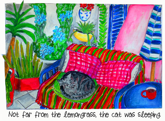 Sometimes in the morning, on our terrace surrounded by plants and bees and butterflies, I look at our sleeping cat, Volver, and feel as if I am in a tableau vivant.