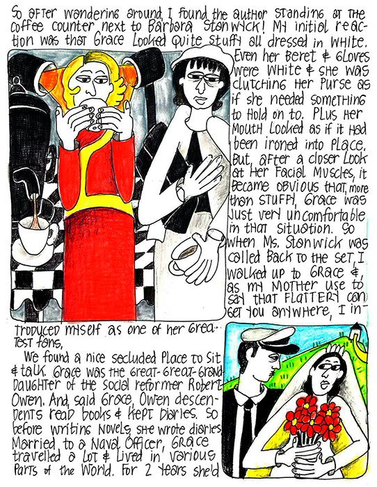 We found a nice secluded place to sit and talk. Grace was the great-great-granddaughter of the social reformer Robert Owen. And, said Grace, Owen descendants read books and kept diaries. So before writing novels, she wrote diaries. Married to a naval officer, Grace travelled a lot and lived in various parts of the world. For two years she’d lived in China.