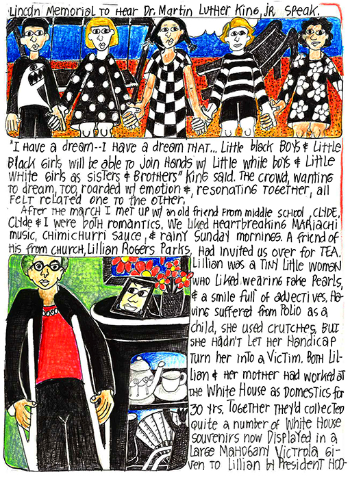 After the march I met up with an old friend from middle school, Clyde. Clyde and I were both romantics. We liked heartbreaking mariachi music, chimichurri sauce, and rainy Sunday mornings. A friend of his from church, Lillian Rogers Parks, had invited us over for tea. Lillian was a tiny little woman who liked wearing fake pearls and a smile full of adjectives. Having suffered from polio as a child, she used crutches. But she hadn’t let her handicap turn her into a victim. Both Lillian and her mother had worked at the White House as domestics for 30 years. Together they’d collected quite a number of White House souvenirs now displayed in a large mahogany Victrola given to Lillian by President Hoover and his wife.