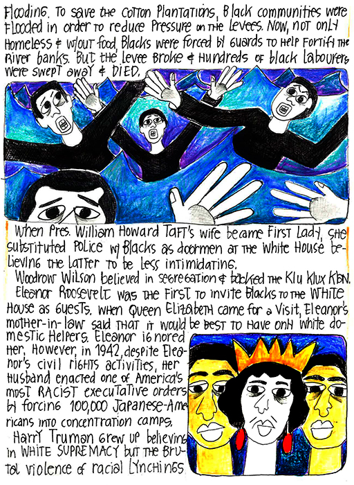 When Coolidge was president, the Mississippi Delta risked flooding. To save the cotton plantations, Black communities were flooded in order to reduce pressure on the levees. Now, not only homeless and without food, Blacks were forced by guards to help fortify the river banks. But the levee broke and hundreds of black labourers were swept away and died.
