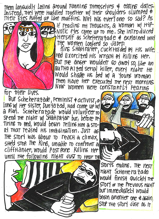 But Scheherazade, feminist and activist, along with her sister, Dunyazad, had come up with a plan. Scheherazade would volunteer to spend the night with Shahrayar but, before retiring to bed, would begin telling him a story that teased his imagination. Just as the story was about to reach a climax, she’d stop. The king, unable to confront a cliffhanger, would postpone killing her until the following night just to hear the story’s ending. The next night Scheherazade would finish quickly the story of the previous night but immediately would begin another one and, again, stop the story just as it was about to reach its climax. This, according to the plan, would go on indefinitely saving not only Scheherazade’s life but, above all, the lives of many other women as well.
