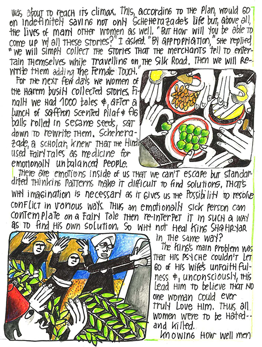 There are emotions inside of us that we can’t escape. But standardized thinking patterns make it difficult to find solutions. That’s why imagination is necessary as it gives us the possibility to resolve conflict in various ways. Thus an emotionally sick person can contemplate on a fairytale then re-interpret it in such a way as to find his own solution. So why not heal King Shahryar in the same way.