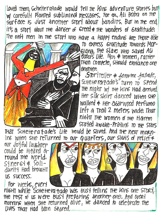 Storyteller and femme fatale, Scheherazade’s turn to spend the night with the king had arrived. Her silk skirt danced when she walked and her agarwood perfume left a trail two meters wide. That night the women of the harem stayed awake praying to the stars that Scheherazade’s life would be saved. And the next morning when she returned to our quarters, our sighs of relief and our joyful laughter could be heard around the world. Synergy and solidarity had brought us success.