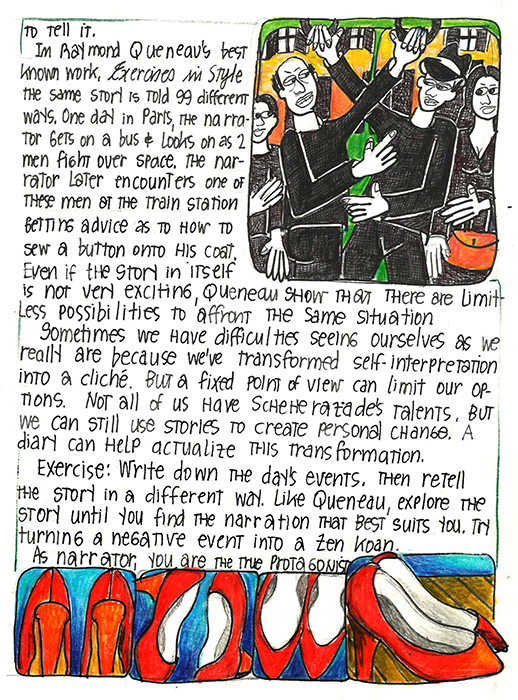 Exercise: Write down the day’s events. Then retell the story in a different way. Like Queneau, explore the story until you find the narration that best suits you. Try turning a negative event into a Zen koan.