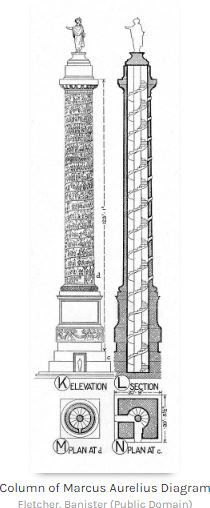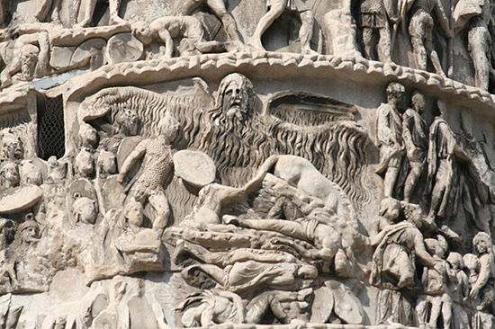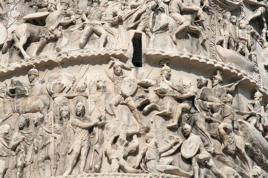 After the Romans won, to celebrate their victory, they erected a historiated column (colonna istoriata). A historiated column is a freestanding column decorated with spiralled figurative imagery that tells a story. In the middle of Piazza Colonna in Rome exists such a column erected between A.D. 176 and 193. It commemorates Marcus Aurelius’ greatest accomplishment—that of holding the empire together by defeating the invading Sarmatians and Marcomanni.