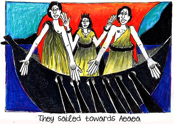 I knew Odysseus was still alive. I’d been instructed by the Moirai not to cut the threads from my weaving as it would also cut Odysseus’ life. He’d managed to survive all those dangerous adventures only because every day for 20 years I continued to weave, unravel, and reweave again the tapestry of his life. Only once he was back in Ithaca, Odysseus showed no joy nor gratitude in being reunited with his family. He was always belittling Telemachus saying that his son would never be the great man his father was. And despite Odysseus’ being dismissive with me during the day, at night he demanded that I fulfil his petty sexual needs. He was a lousy lover and maybe that’s why, jealous of my suitors, he had them all killed leaving their blood everywhere. And in his typical way, instead of cleaning up his own mess, Odysseus had my maids do the cleaning for him. His lack of respect for others totally disgusted me. So I stopped weaving and cut my threads. A few days later Oysseus died. I didn’t feel at all guilty but I understood that, thanks to the vultures, my life was now in danger. And, since everyone wanted to believe that Telegonus was responsible for Odysseus’ death, his life was in danger, too. Telegonus, Telemachus, and I had no choice but to sail towards Aeaea, Circe’s island.
